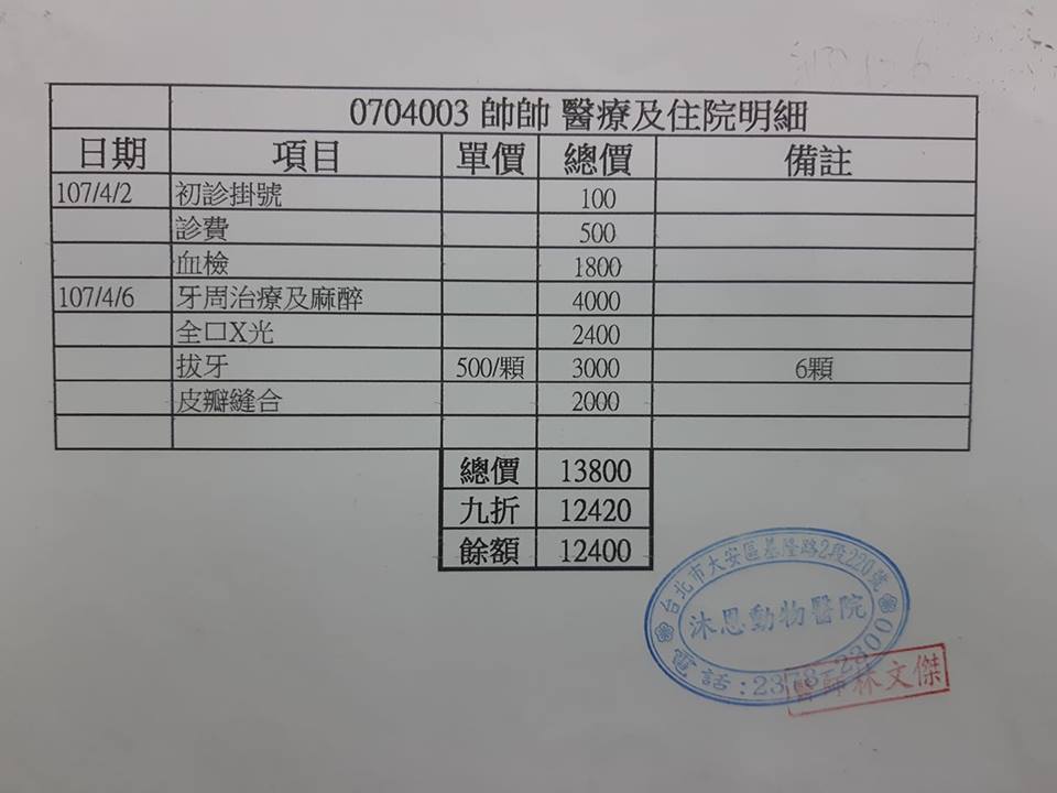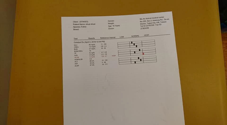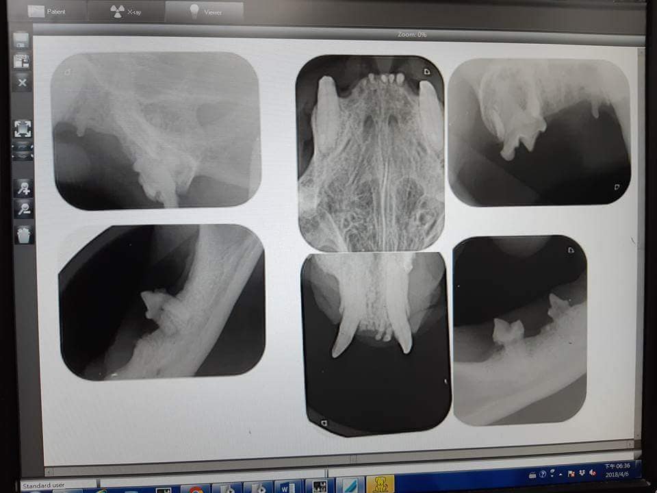 照X光檢視牙根狀況後醫生認為要拔牙,牠的血檢報告,紅白血球,血小板都正常,免疫球蛋白有稍為高了一些,是因為牙齒正在發炎,指數並沒有超出太多,都在正常的標準內,最主要是肝腎指數不能太差,才可以接受麻醉,於是便在4/6進行拔牙手術,一共拔了6顆牙。
