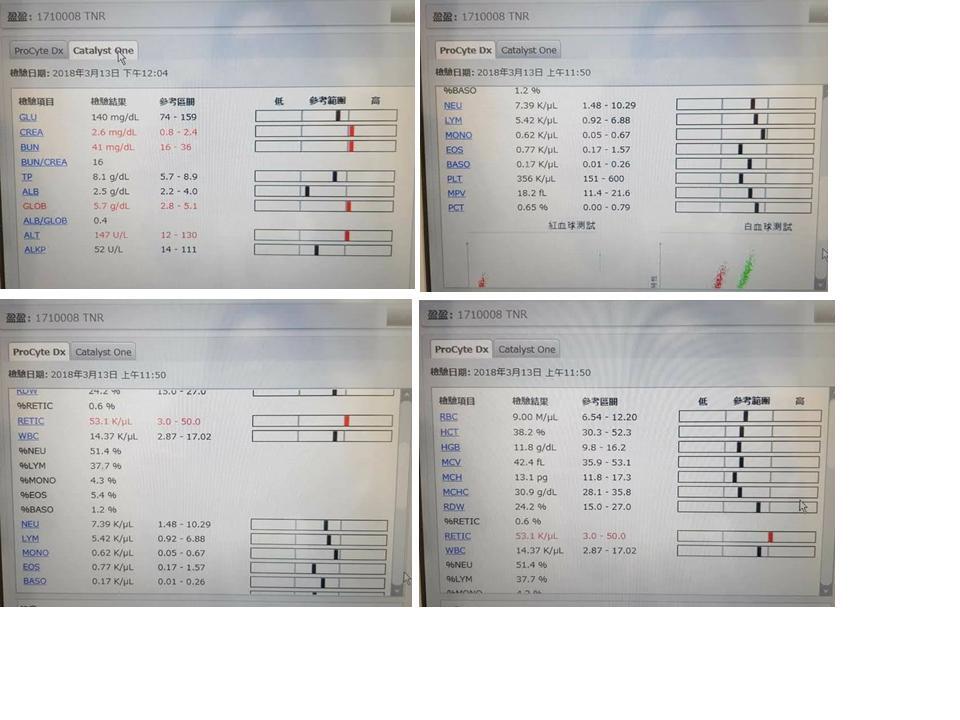 盈盈因原來的生活環境惡劣,飲食不佳,使得她健康狀況很差,除了嚴重口炎、 鼻膿、還有貧血,每天都要服用免疫抑制劑治療控制口炎、為改善貧血須吃倍補血,也每日為她做氣霧治療,並定期回診檢查。