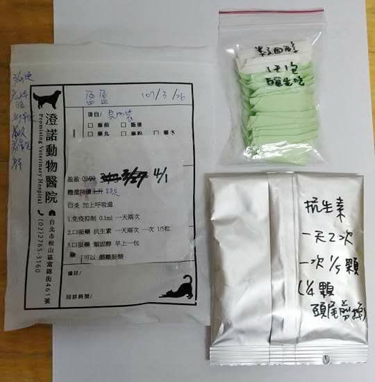 1.抗生素:每天兩次,每次1/5顆(剪1/4顆,剪掉氧化黃色處為1/5顆),需避光。餵嬰兒泥。
