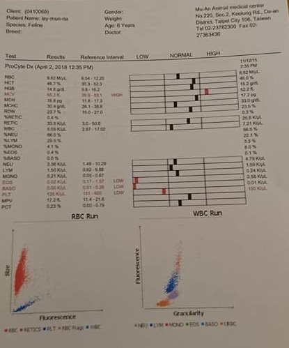 雷夢娜,體重5.44有進步,紅血球狀況有改善,紅血球降到8.2 表示有補充到水分。