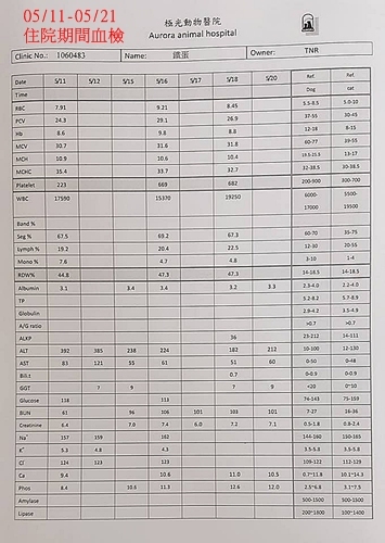 血檢結果:腎指數差不多,肝指數很好,磷離子有降一點點下來了,白血球正常,血糖部份稍高,所以這次類固醇的用量會減少一些些並加入一些制酸;鉀離子正常,但是在正常值的邊緣,所以皮下注射改為生理食鹽水;紅血球指數掉一點點及今早便便顏色較黑,可能是腸道有點出血,因長期吃類固醇,即使劑量較少,還是會對消化道造成一些影響,這次將類固醇減量後看是否有改善。