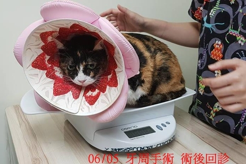 動物近況說明: 花嬸在牙周手術後的恢復情況良好,定期回診檢查口腔及腸道,戴著大花朵兒頭套的花嬸每天都很悠哉的翻肚肚睡覺,腳開開的模樣非常可愛,希望她的健康能持續穩定。