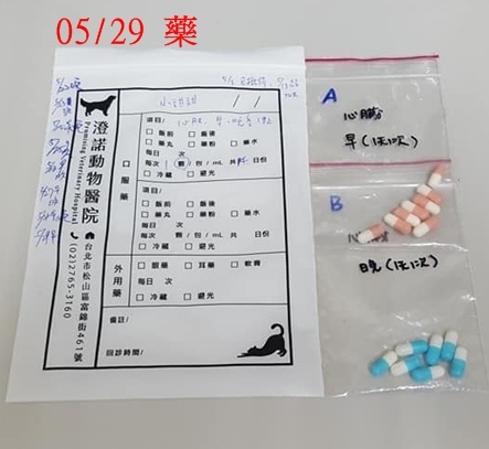 《早》《晚》各一顆心臟藥,請照藥袋標示投藥。
