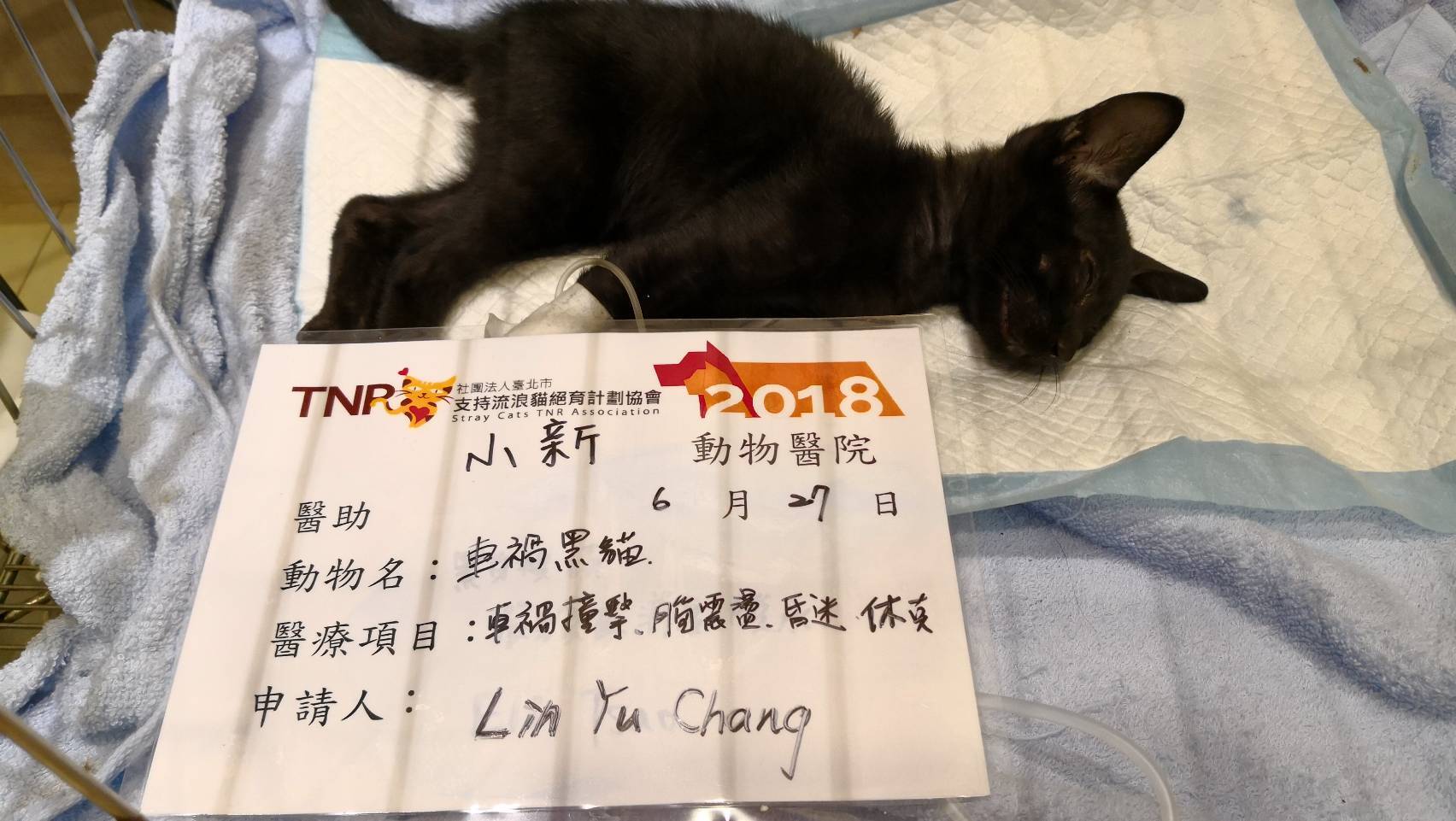 主題: 車禍黑貓 申請者姓名: 張菱予 花色: 申請日期: 2018-07-26 11:35:18 申請者部落格: 申請者臉書網址: http://www.facebook.com/clyanal 所在縣市/合作醫院: 高雄市/小新動物醫院 治療費用: 12150元 需求人數: 26人 已結案 (2024-06-01 13:09:58) 報名人員: 珊珊(已付款)、郁婷(已付款)、lin789 x14(已付款)、Fenny x10(已付款)、 候補人員: 動物病情說明: 晚上十點半在國道十號匝道口看到小黑趴在路中央不能動彈,高速公路上的車在小黑咫尺處疾駛而過,情況非常緊急,暫停路邊等待時機衝上前去把滿臉是血的他帶離路面!仔細查看發現小黑眼睛鼻子有出血狀況,四肢有反應但無力,僅能微微晃動,研判受到不小的撞擊!儘速送往小新動物醫院,醫生做初步觸診時小黑並無太大反應,雙眼緊閉,但是仍有意識、心跳,但有失溫狀況,趕緊給予保溫和輸液治療,先把生命跡象穩定下來再進行後續治療! 動物近況說明: 小黑到院後先穩定生命跡象,輸液治療並使用降腦壓藥物治療腦傷。接著照X光檢視是否有骨折,所幸小黑骨頭並未受到傷害。治療初期小黑並無法正常行動,僅能將頭微微抬起進食,但持續給藥輸液治療兩週後能正常行走,研判已無生命危險,故接出院自行中途照護。在此感謝各位捐款人,讓求生意志強烈的小黑能夠得到良好的醫療照顧!