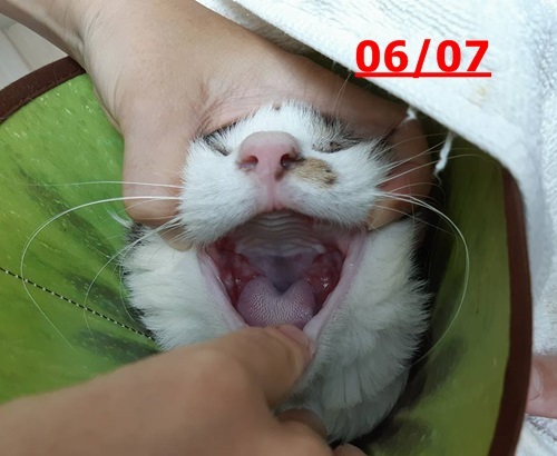 口腔內的紅腫處與前次相較已改善很多,血檢結果,服用免疫抑制劑後,發炎退較多了(TP 9.1,6/7是9.6),腎指數有升高一些,因之前有將類固醇調高一些的原故,所以這次會降低類固醇的劑量及加開活性炭,活性碳膠囊打開混入乾乾內,請觀察冠冠是否願意吃及排便情況,如果不願吃,或有便便異常、便祕情形,再請通知醫師。