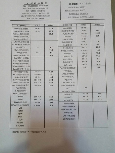 主題: 嚴重腎衰+脫水黃疸及口腔潰爛的明太子 申請者姓名: 周佳旻 花色: 申請日期: 2018-07-19 22:33:31 申請者部落格: 申請者臉書網址: chiachia1981@gmail.com 所在縣市/合作醫院: 高雄市/小新動物醫院 治療費用: 6500元 需求人數: 15人 已結案 (2024-06-01 13:09:30) 報名人員: Pallina(已付款)、lin789 x14(已付款)、 候補人員: 動物病情說明: 高雄已經下超過一個星期的大雨了,外面的孩子們都無法好好出席吃飯,每天都是三三兩兩的,不是少那隻就是少這隻的,好不容易終於有段時間雨停了,趕快衝去放飯,孩子幾乎都有出來,但還是少了那一兩隻,心想敲一下罐頭沿路找找說不定叫得出來,敲著敲著走著走著,咦!在愛玉冰攤子下面有一隻,奇怪怎麼不出來,不太動耶,是怎樣?走近一看,明太子!!消失三個多月的明太子!他還在耶!餵食地點是個傳統市場,貓孩來來去去的,其實很習慣了,當孩子消失了超過一星期,我都會當他不在了,所以明太子的出現絕對不是來報恩的,他一定是病了,趕快衝回家拿提籠,明太子居然病到我用手就可以抓到放進籠子裡,可見他真的很嚴重,全身只剩骨頭,呼吸很微弱,別想了,趕快送醫要緊。 動物近況說明: 送醫的當天晚上,醫生就有說明太子的狀況不是很樂觀,明太子在撐了一個星期之後還是離開了,很遺憾,但還是很謝謝醫生和助理們的幫忙照顧,明太子的醫療費用還懇請大家多多幫忙,謝謝!