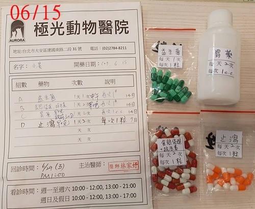 (3) 止瀉:6/15晚開始吃,每天2次,早、晚各1顆,吃完就停,等下次回診再看情況。