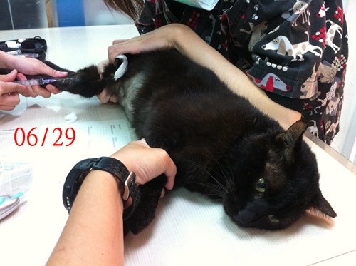 長久的流浪生活讓鐵蛋的身體狀況很不好,有貧血、肝腎指數偏高,肝炎,腎功能不全,膽結石,協會持續帶他就醫治療,但情況一直無法長時間的穩定,起伏變化很大,在6/3晚上,鐵蛋突然軟癱,協會人員緊急將他送往24小時醫院急診;原本訂於6/29回診,但因連著幾日都沒有自己進食,外觀明顯變瘦,於是提前在6/26帶他回診,檢查結果,除了肝腎指數上升,還驗出了糖尿病,需要開始打胰島素,6/29再回診檢查並做血糖曲線圖。