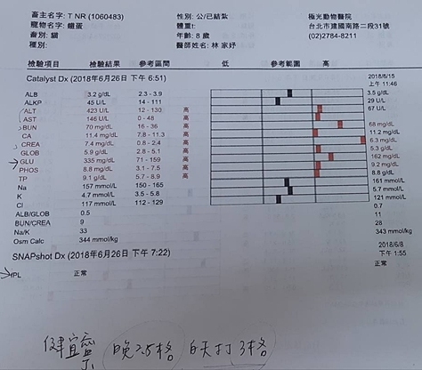 鐵蛋上次回診GLU血糖高達335,在今日下午13:00量測值為152,15:00餵食量測值為196、、後17:00量測值為186,所以目前胰島素的劑量可以穩定控制血糖,本次的肝指數ALT(249->423)、AST(146->67)及腎指數BUN(70->60)、CREA(7.4->6.4)都有降低,本次有加驗的黃疸指數TBIL為1.0(正常為0.0-0.9),該指數偏高的話易造成噁心、嘔吐。整體來說症狀及血檢都比上回好,且明日要轉給蘇醫師看診,故藥劑皆不改變只先開一天的用量。