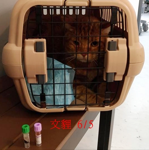 文貍口腔右下牙齦處有點紅外,後口部分好很多,血檢報告TP值 8.7 -> 8.8 ; 看診台上有尿及軟便,頭套可以不用戴了