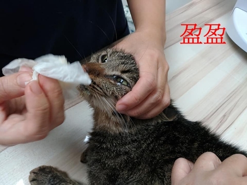 盈盈是救援案的貓咪,被救援前可能歷經過全口拔牙,口腔呈現嚴重的發炎,並有多處傷口癒合不良,血液檢查有肝指數上升與貧血的症狀,並合併呼吸道感染狀況,當時身體十分虛弱。