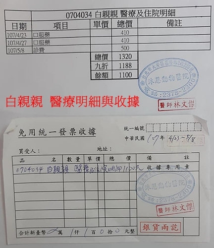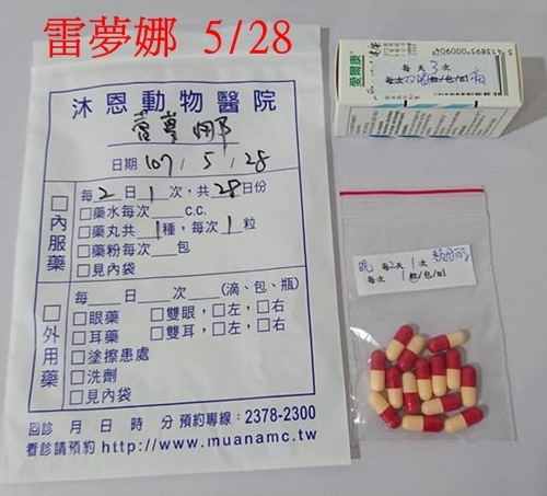 今年4/23因要捐血救小居,所以白親親到了醫院抽血配血型,原本配上了,但是她流鼻水,剛好內科名醫蘇醫師帶自己狗去手術,特別替白親親配藥,醫生們額外替白親親提供服務,先配7天份觀察(早晚各一顆) 。
