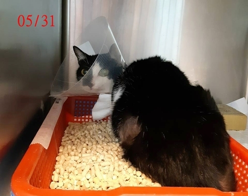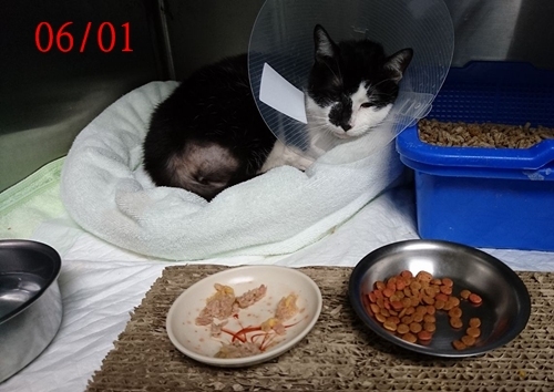 2018.4.4照護員發現小居沒有食慾,嘴邊還有口水污漬,就醫檢查發現口腔有處潰爛,留院詳細檢查驗血、照超音波後發現有水腎,口腔潰爛即是水腎引起,因情況嚴重轉診至泌尿專科,再次照超音波顯示小居的水腎情況相當嚴重,必須進行尿道繞管手術,於4/21晚上進行了手術,發現小居的排尿管已斷,尿液一直滲出在腎臟週圍使臟器多處沾黏,牠的排尿管應是兩年多前的絕育或截肢手術時被弄斷的。因術後血容比低,小居有接受輸血,在術後幾日都是危險期,為了給小居最好的醫療看護品質,協會安排小居住進台大動物醫院接受24小時的專業看護。