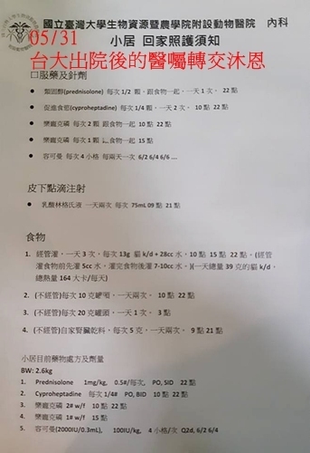 動物近況說明: 照護員遵照出院照顧須知給藥、皮下注射及詳細記錄飲食,並與醫生保持密切連繫回報小居情況。