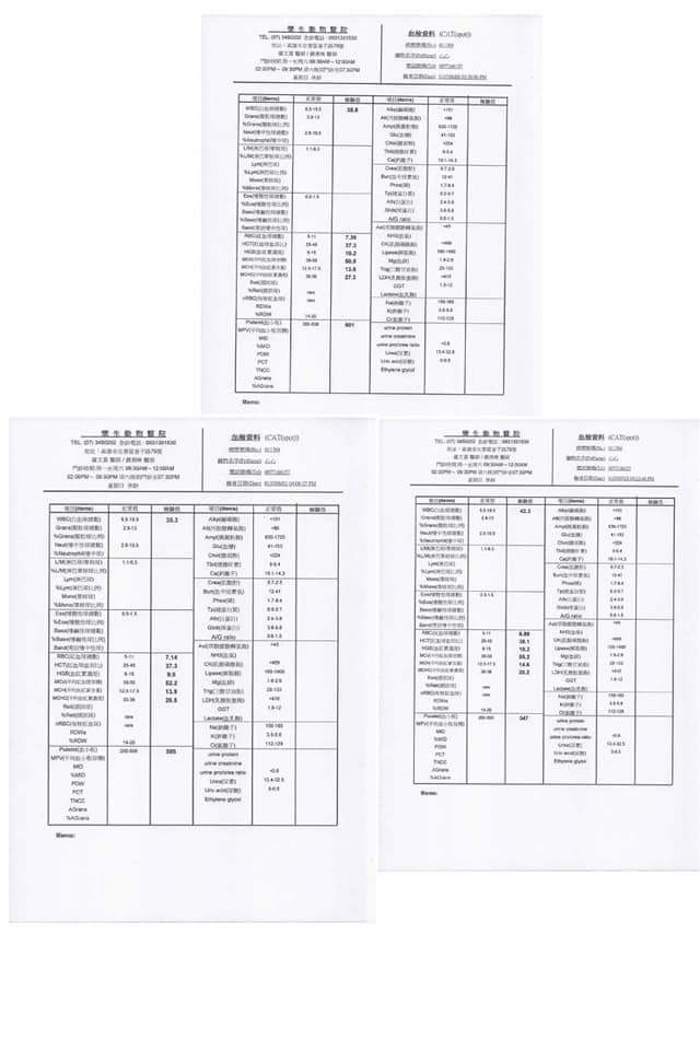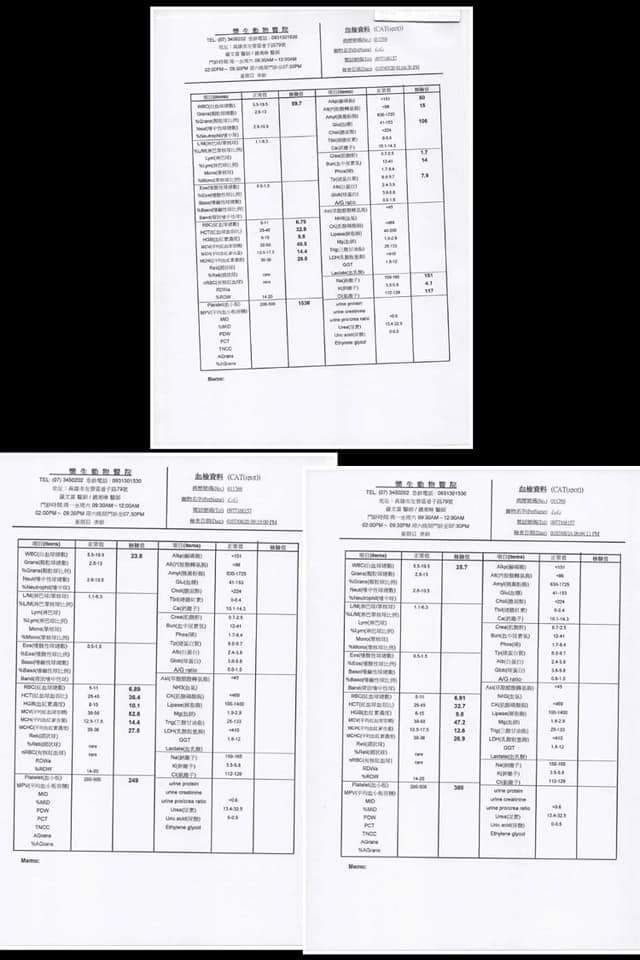 心心有脫水,初步血檢,白血球過高,貓二合一檢驗均為陰性,但有出現打噴嚏及咳嗽的現象,目前已給藥及點滴治療,如果呼吸感染變嚴重會多氣霧治療的費用