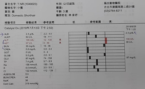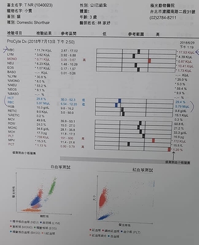 腎指數在正常值,白血球指數11.74,上次17.53,已有下降到正常值,紅血球指數先前因為有消化道出血的情況所以較低(5.79),今日有上升回來一點(5.97),肝指數升高應是前次為了治療小賓打噴嚏,在藥裡多加了一種抗生素的影響。
