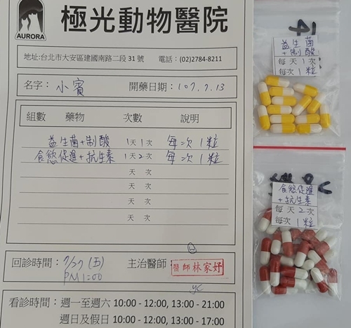 (1) 食慾促進劑(原本含兩種抗生素 這次只有一種):每天2次,早晚飯後各1顆。