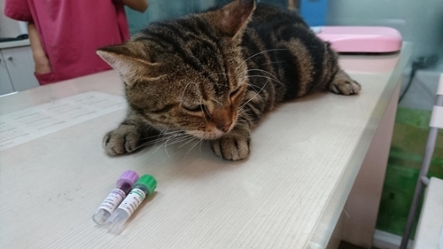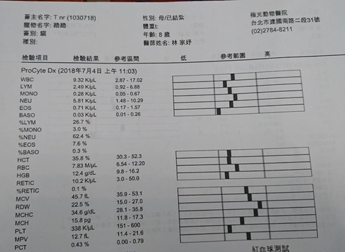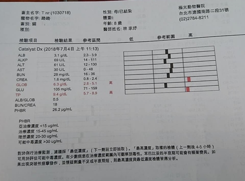 今日血檢,苯巴比妥濃度有偏高一點PHBR 26.2(理想值20-30),還在容許的正常範圍內,原則上還不需要調整癲癇藥物,肝腎指數都還OK,腎指數稍高一點點,也在安全範圍內,免疫球蛋白GLOB 6.3偏高(以前也有過5點多) ,如果沒有打噴嚏症狀表示還好,腹部及腿部掉毛狀況,有過度理毛的現象是一種焦慮的表現,會加一些放鬆、鎮靜的藥物。