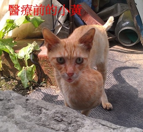 小黃是協會接獲通報自南部救援北上治療的流浪貓咪,當時牠腿上長了很大的腫瘤,據通報人告知此情況已將近1年,協會將牠送往重症醫院治療,因非常瘦弱,住院幾天後才動手術將腫瘤取出,因腫瘤過大無奈需一併截肢,流浪生活及腫瘤讓小黃的健康情況很不好,腸道結構已改變、大腸太粗、有巨結腸導致大便較容易累積排不出,所以小黃需要長期吃軟便劑等藥物以幫助牠排便,並定期回診追蹤檢查。