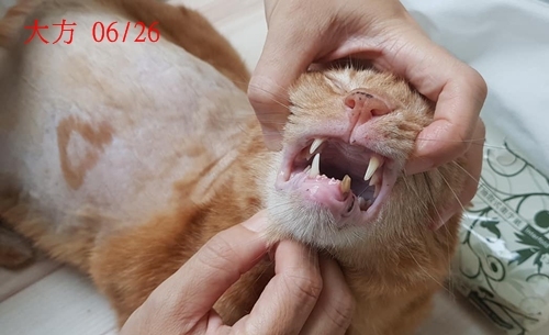 另大方前排左下犬齒鬆動,看起來是齲齒,觸診時大方會閃應該會痛,建議等他身體狀況痊癒穩定後再處理。