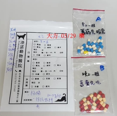 大方的體重持續上升,所以今日未作血檢,因用藥中仍含有食慾促進劑,這次的藥中拿掉食慾促進劑,只在特定日期的(桃紅色膠囊)加入,要請照護員觀察,給紅色膠囊當天,食慾是不是有明顯變好。今天有用耳藥清潔耳朵。