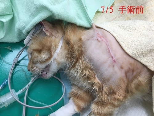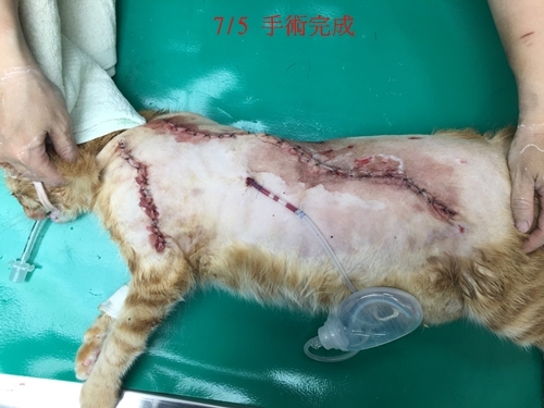 手術縫合的傷口癒合正常,已拆線.因皮膚張力的狀況,仍有部分疤痕因為傷口過大關係未能全部移除,日後需要觀察貓咪是否有因傷疤而搔癢不適的狀況.