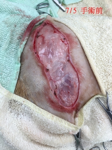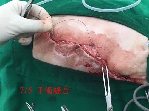 7/5 進行手術.大範圍的痂皮處為全厚度的皮膚壞死,儘量在皮膚張力容許下將壞死皮膚.疤痕移除及縫合.仍有部分疤痕因為傷口過大關係未能全部移除.