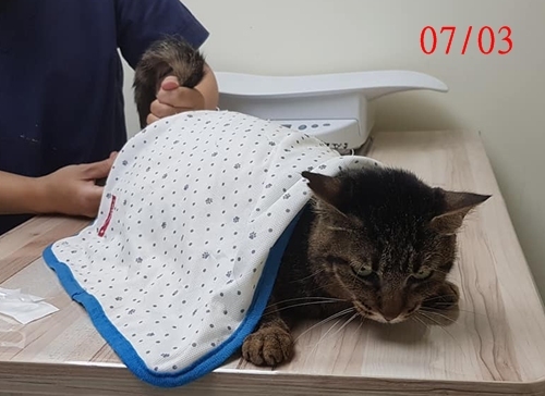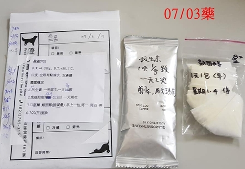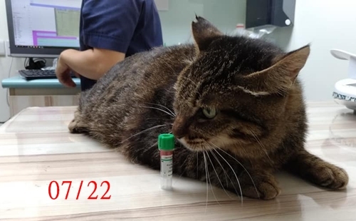 盈盈的體重穩定,今天檢查時左眼有淚水,左鼻孔有鼻膿,這次的藥物會增加抗生素。血檢結果,盈盈的腎指數來到Crea4.3, Bun44,和醫生確認需要進行皮下輸液 (林格兒液100ml,每天一次),只是盈盈容易緊張,所以由協會照護員自行討論執行上是否可行。