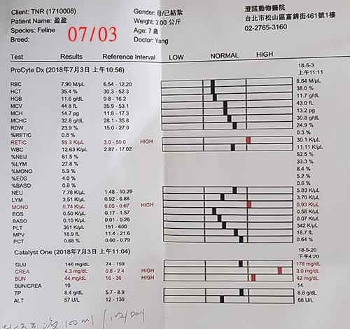 血檢結果,盈盈的腎指數Crea3.7(上次4.3), Bun36(上次44),都有降低,且BUN回到正常範圍內,表示皮下注射有產生效果。