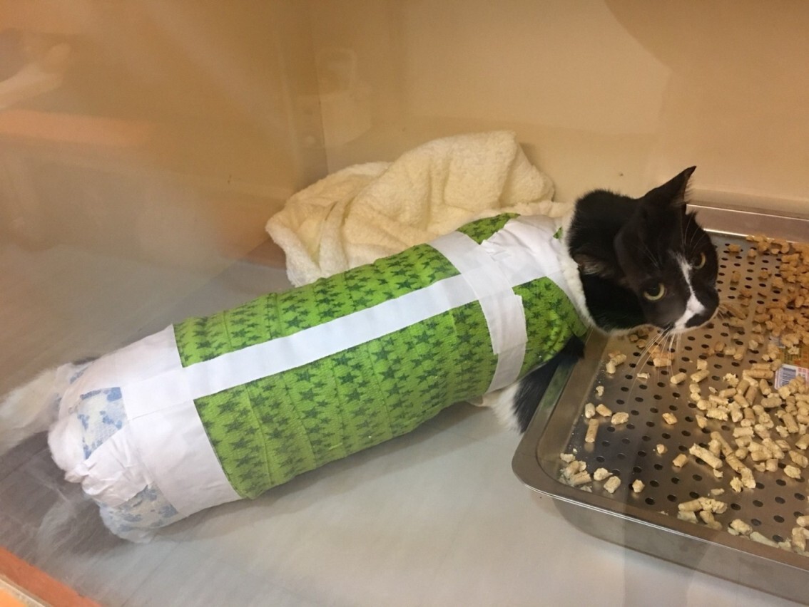 2018/8/18 維康院長看了斷層掃描的片子,認為賓賓的神經應該不需要脊椎手術,決定讓賓賓穿固定貓咪身體的背板約兩個月,讓貓咪以住院復建的方式來自行恢復神經功能。