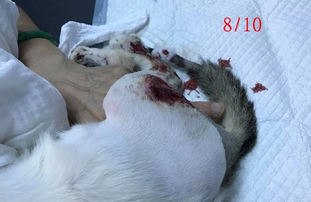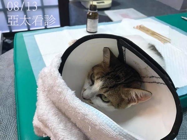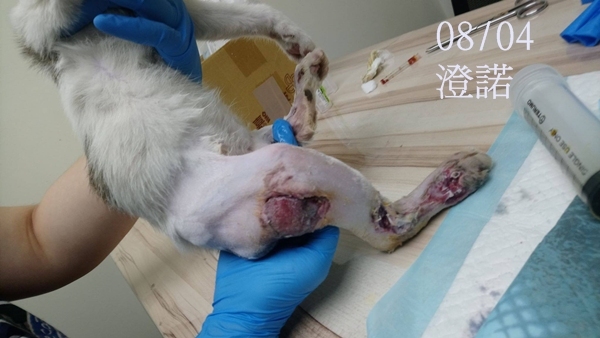 接到通報人電話後,協會即帶誘捕籠設籠捕捉,立即送往澄諾醫院,醫師先為小綠進行血檢、清創、包紮,醫師觀察診斷後提出須要截肢以避免感染引發敗血症,否則有生命危險,但協會思及小綠年紀尚幼,在誘捕時能跑及跳躍,又血檢白血球並未有嚴重感染情況,為求給小綠一個保全健康軀體的機會,於是8月6日將小綠自澄諾醫院帶出院尋求亞太葉醫師的協助,感謝亞太葉醫師百忙中為小綠看診,葉醫師建議先以清創、投藥方式觀察幾天,看是否能保住腿。