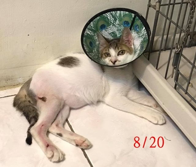 動物近況說明: 小綠在葉醫師的醫療、照護指導及照護人員遵照醫囑小心敷藥、細心照顧下,傷口一日日好轉,傷口明顯收小,加上小貓求生力強,恢復佳,照護員每日餵食小綠高營養的食物也讓小綠長胖很多,神情模樣越來越可愛,但因小腿腐蝕嚴重、傷及韌帶,未來是否會影響日後行走敏捷度,都有待觀察,髖關節脫位現象也需待狀況穩定後,才能一併處理,協會會盡一切努力給小綠弟弟最好的醫療與照護,希望他可以很快完全恢復,再為他找個最好的家,讓他一生快樂幸福。
