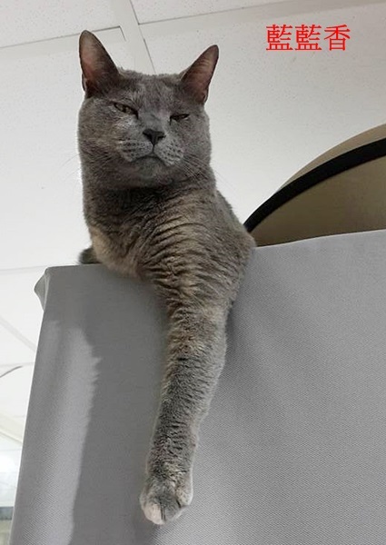 藍藍香是102年協會從收容所救出的貓咪,當時她被補獸鋏夾住,兩條前肢已化膿腫脹,渾身散發著惡臭,除了嚴重鼻氣管炎,還懷有身孕,原本已被列入安樂死名單,協會志工接到通知,一早立即趕去將她接出送醫。