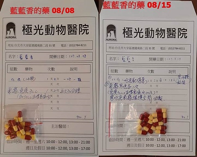 註:舊藥先吃。動物近況說明: 罔市除了每日服藥控制心臟病,照護員並早晚測量她的呼吸心跳,罔市個性很乖巧相當撒嬌,常常在幫她測量呼吸時一直翻肚肚大聲呼嚕,模樣真是可愛極了,希望她一直健健康康的。