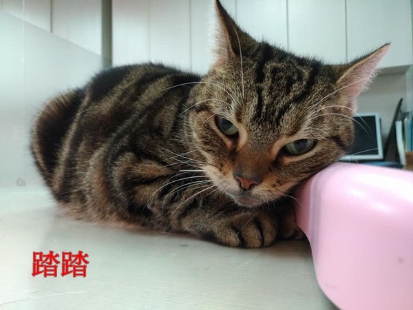 踏踏是在2014年志工去到五股收容所時,看到她隔著籠子不停的磨蹭,很撒嬌的對著志工喵喵叫,經志工詢問所方人員,得知踏踏是因為癲癇而遭到主人棄養,志工於心不忍,便將她接出送醫院治療。