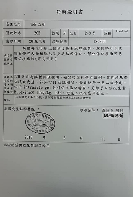 Zoe是隻可愛漂亮的虎斑母貓,在敦化公園附近生活多年,一直親人乖巧,不幸也遭變態盯上,背部側腹被潑灑化學液體造成大片潰爛傷口,協會在7月6日誘捕到她送至愛屋動物醫院,醫師研判她應在6月初時受傷的,且依傷口外觀,醫師認為是熱源或是腐蝕性液體造成的,想到她拖著這樣的傷口不知有多痛的忍著這麼多天,令人對該死的變態垃圾虐貓犯更加深惡痛絕,能對無辜的親人街貓下此殘忍的毒手,真是十足的心理變態,應受到眾人的唾棄不齒,人人都須提防這樣的社會敗類。