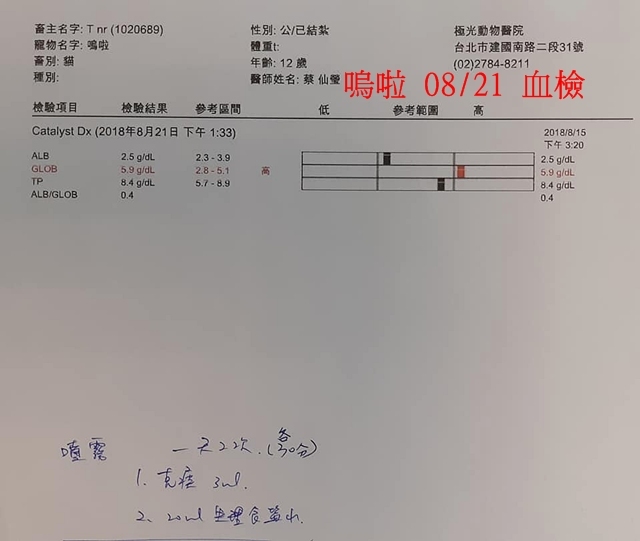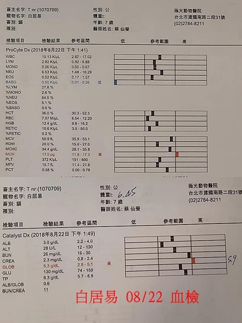 血檢較前次多數有變好,GLOB雖然仍是較高,這是因為白居易是卡里西癒後貓咪的原故。