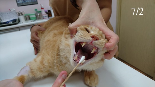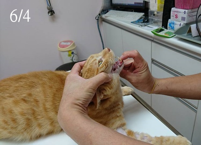 口腔部份,原先保留的幾顆前牙,目前還是有些功能性,吃飼料時比較不會掉落,因後口炎部份,還是滿嚴重的,若是蔓延到前面,很有可能需要拔掉前面的牙齒。