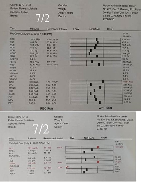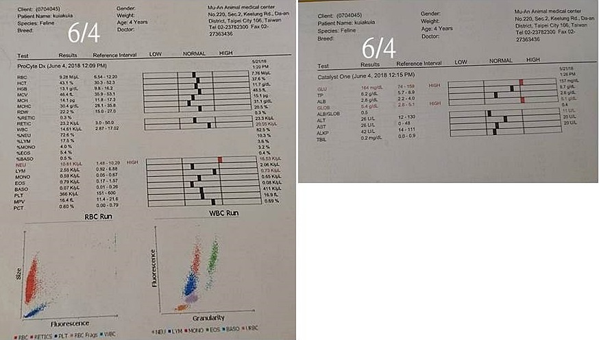 可大約兩個月再回診,要定期血檢,發炎指數GLOB 上升至5.7上回5.4(變差),只要食慾沒有受影響就沒什麼關係,若高到6就需回診調劑量。