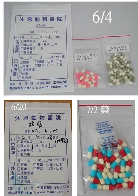 拐拐原是6/25回診,但加上拐拐會共有4隻貓咪,於是詢問醫生可否有哪隻貓咪可調整其他時間,醫師評估後,今日告知拐拐與雷夢娜可先拿兩週藥,之後再安排時間回診。