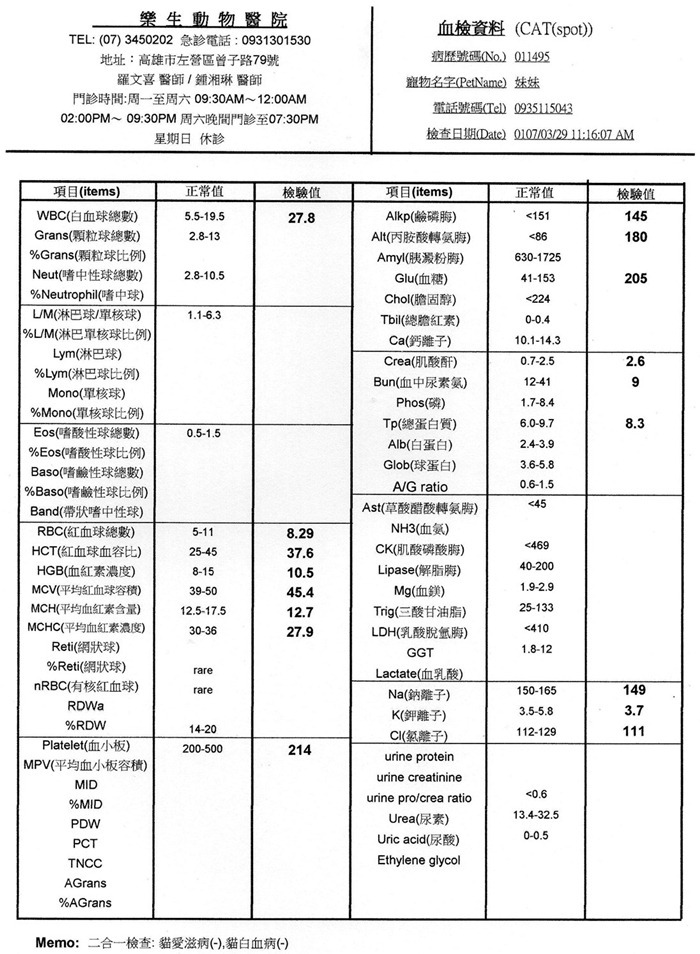 主題: 餵養區多天不進食 申請者姓名: 劉素鳳 花色: 申請日期: 2018-10-31 17:33:05 申請者部落格: 申請者臉書網址: https://www.facebook.com/sufeng.liu 所在縣市/合作醫院: 高雄市/樂生動物醫院 治療費用: 27750元 需求人數: 58人 已結案 (2024-05-31 18:41:01) 報名人員: LYNN CHEN x2(已付款)、陳冠綸(已付款)、小咪毛(已付款)、Rachel Hsieh x2(已付款)、sharonhuang9(已付款)、Daniel Tsai x2(已付款)、vivian(已付款)、豬豬(已付款)、Kitty Chen x2(已付款)、黃琦珊(已付款)、山喵的爸(已付款)、Gigi x4(已付款)、Kaka Lin x2(已付款)、orange x10(已付款)、Sol x4(已付款)、Wanyun Chen、珮涵(已付款)、心桓(已付款)、mint x2(已付款)、nicole chen(已付款)、nicole chen(已付款)、Kitty Chen x2(已付款)、何偉靖(已付款)、布魯陳 x10(已付款)、hank(已付款)、lin789 x3(已付款)、 候補人員: 動物病情說明: 餵食區發現這隻浪貓多天不吃,初步到院檢查有脫水及肝指數過高的現象且白血球也過高,有發炎的現象,沒有貓愛滋及貓白血病,目前以上點滴及給藥做初步治療