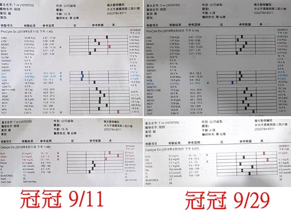 血檢有貧血現象,造血針改為每周施打一次。腎指數持平(Crea4.0/4.1)(Bun50/51),有可能是飲食上的改變,或者是冠冠並不需要早晚共200cc皮下輸液, 因此降低輸液量,再持續追蹤。