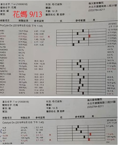 發炎球蛋白指數有再下降,因牙周手術後口炎需要時間恢復、牙瓣縫線也需要4~5個月才能被完全吸收,所以指數還要些時間才能降到正常值內,牙齦也會還有些紅,就整體而言,花媽口腔恢復的情況很好,所以會調降類固醇的劑量,但為控制口炎,免疫抑制劑仍須要繼續、長期服用。