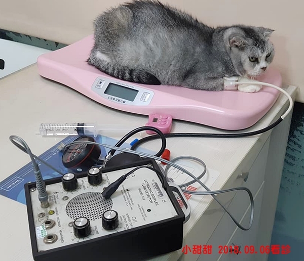 測量結果收縮壓120,沒有問題,心跳126,雖然這樣的心跳較一般正常貓咪慢,但對有心肌肥沃症的小甜甜反而是好的。
