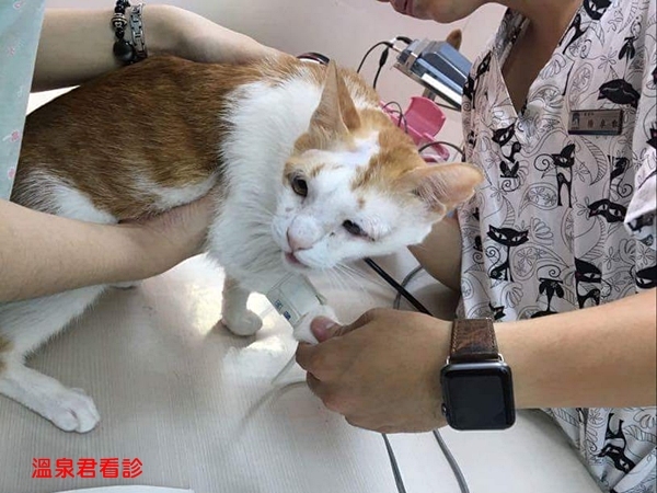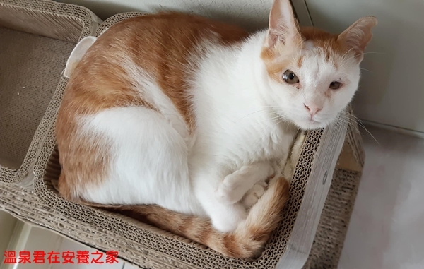 溫泉君是被貓友從臭水溝中救起,當時他的頭皮疑似被狗咬傷,破了很大一個洞,整塊頭皮不見,志工緊急將他送醫檢查治療,醫生進行整形縫合手術,術後在醫院住院很長一段時間,因為溫泉君的頭上總是包了一個敷料紗布,眼睛因為天生眼瞼畸形都半睜著眼,模樣像極了正在泡溫泉享受的小老頭,因而被醫生取名為溫泉君。