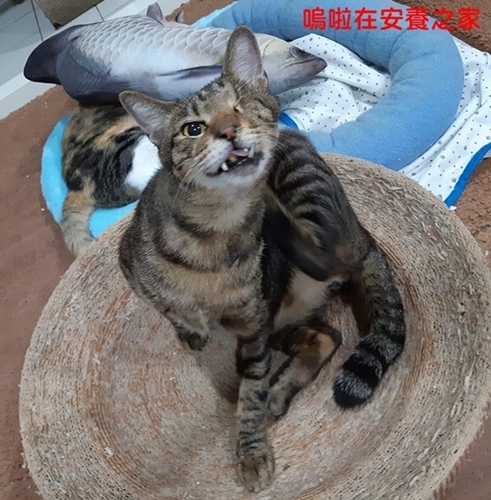 嗚啦在術後只剩一隻眼睛,因為神經受損瞳孔無法正常縮放,但是他的眼神卻非常真誠美麗,個性又好乖巧,很喜歡撒嬌討摸摸,讓人非常疼惜,也和安養之家的貓咪室友相處很好常常互相理毛,非常可愛,在每日服藥及照護員早晚為他做氣霧治療幾週後,食慾已變好體重也逐漸回升,希望他一直健康開心。