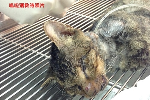 嗚啦是2014/10/8從板橋收容所接出車禍重傷貓,嚴重撞擊造成上下顎骨頭脫臼、左右位移無法閉合,又驗出愛滋帶原,免疫系統較差、復原較慢,送醫時,已有嚴重感染的問題,醫師緊急手術裝置食道餵管灌食、上靜脈點滴,等狀況穩定後,又陸陸續續動過數次手術,包括:下顎骨折修復、結紮、眼窩感染清創及組織摘除修復手術摘除一眼,經歷漫長的手術醫療,嗚啦漸漸恢復健康,本來醫師研判因為傷及神經,可能需要終身灌食,還好嗚啦很爭氣,經過一段時間訓練後,已開始可以自己吞嚥泥狀的食物,於是便將他接回協會安養之家住下。