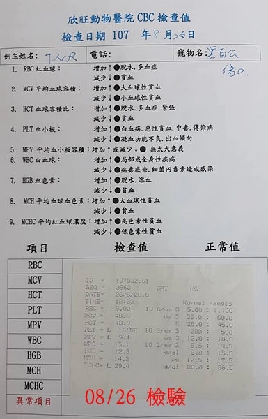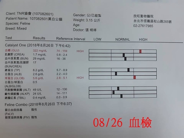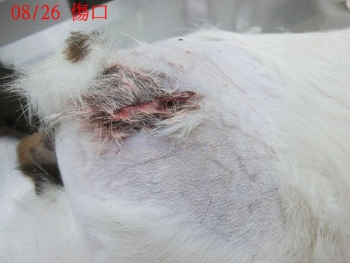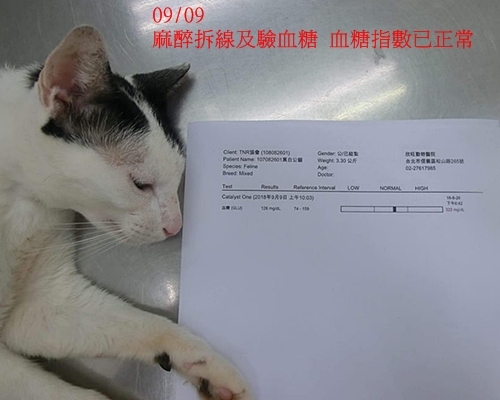 8月26日醫師為黑白公貓咪進行檢查,全套血檢、二合一檢查、x光檢查,傷口一個洞蠻深的已潰爛,血檢顯示可能因疼痛引起血糖升高及有發炎現象,二合一檢驗為陰性,隨後進行手術清創縫合傷口、並同時完成結紮,術後讓貓咪留院以觀察傷口恢復情況及休養。