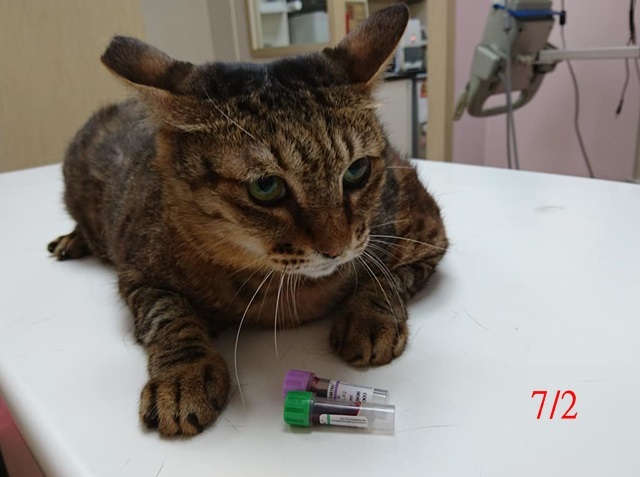 血檢紅白血球還可以,會有點脫水跡象,因紅血球偏高,可能食慾會降低泌尿系統有點問題,可能會有點頻尿,先抽驗尿液 ,尿道感染導致尿液會漏在外面,也可能因皮膚皺褶有關,因太胖皺褶多,容易藏汙納垢滋生細菌,藥膏盡量塗抹在無毛部位,擦在最紅的兩處和下面的溝槽患部,兩塊蓋住尿道的皮(會陰),細菌較多,盡量擦到藥膏。