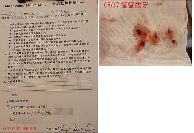 今年4月間工作人員發現管管吃飯時發出疼痛叫聲,嘴角並有黑色唾液痕跡安排就醫,發現有嚴重的口炎,上顎臼齒的牙齦很紅腫,其它部份也有牙齦炎,5/8進行牙周手術拔牙,先將發炎較嚴重的牙齒拔除,術後仍持續回診追蹤。
